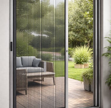 Las mosquiteras correderas se deslizan horizontalmente, facilitando el paso y garantizando ventilación sin insectos en puertas y ventanales.