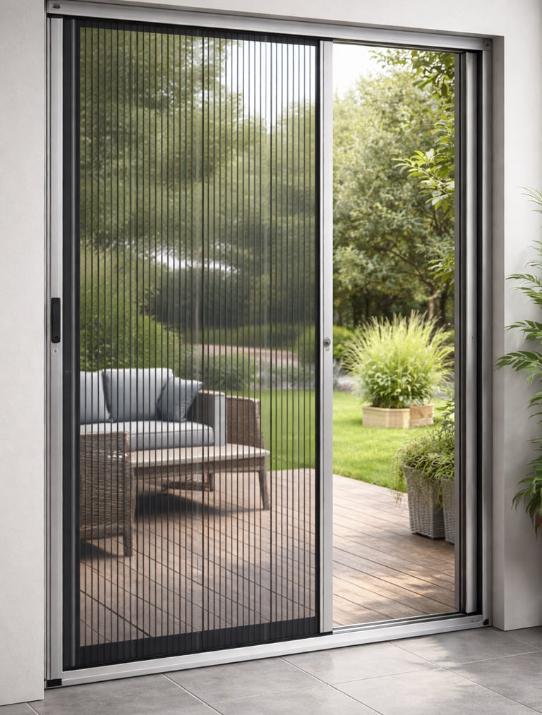 Las mosquiteras plisadas aportan un diseño especial en el espacio, funcionales para zonas de paso. Suelen instalarse en grandes ventanales, disponibles a medida.